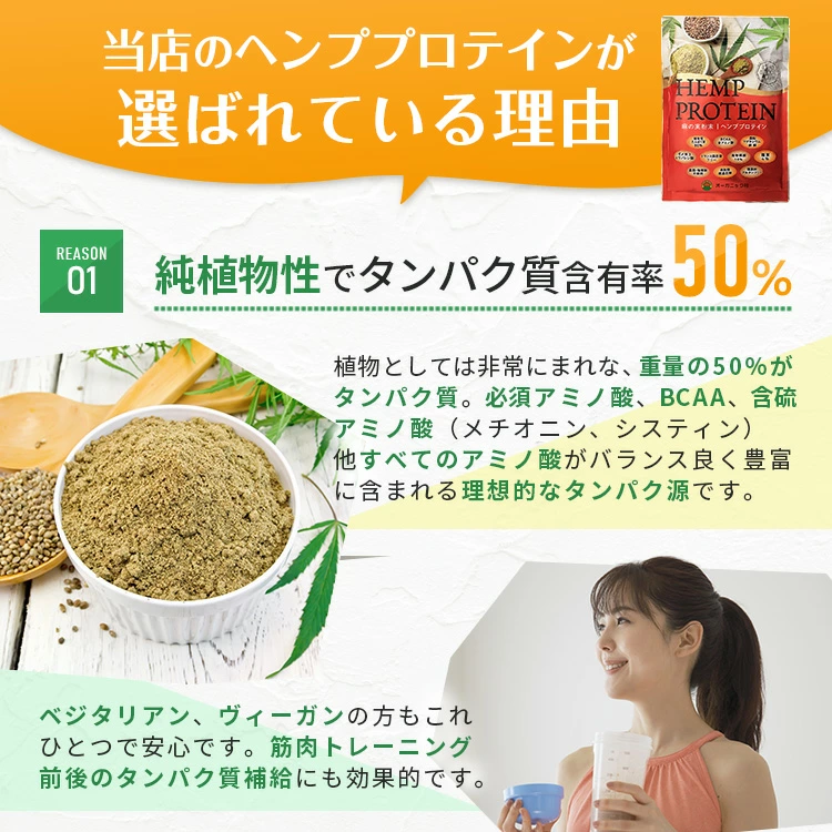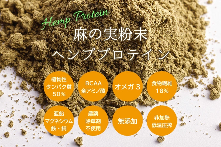 麻(ヘンプ)の種子を原料に作られたタンパク質粉末で、 必須アミノ酸、非必須アミノ酸、ビタミン、ミネラル、食物繊維をバランス良く含む、最も完全に近い純植物性食品です。