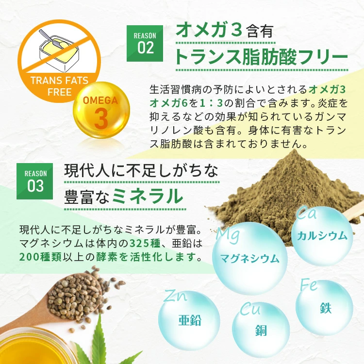 麻の実は七味唐辛子にも含まれている安全な食品です。 麻の種子(実)が持つ健康パワー 【良質な植物性たんぱく質】 必須アミノ酸を含んでいるので元気で強いカラダを作ります。 【麻の実は天然のマルチミネラルビタミン】 【お腹すっきり(食物繊維がたっぷり)】