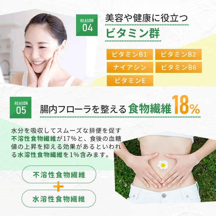 - 水溶性食物繊維 粘着性により胃腸内をゆっくり移動するので、お腹がすきにくく食べ過ぎを防止します。糖質の吸収をゆるやかにし、食後血糖値の急激な上昇を抑えます。 食物繊維は腸内細菌にとっても重要な栄養素です。