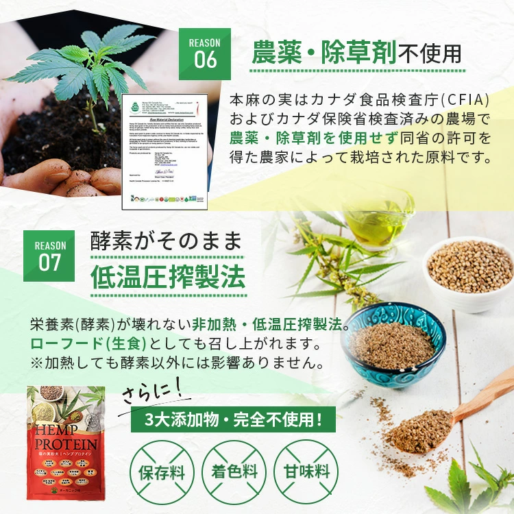 - 【農薬・除草剤不使用】本麻の実は、カナダ食品検査庁(CFIA) およびカナダ保健省の検査を受けた農場で、農薬・除草剤を使用せず、 同省の認可を得た栽培者によって栽培されています。
